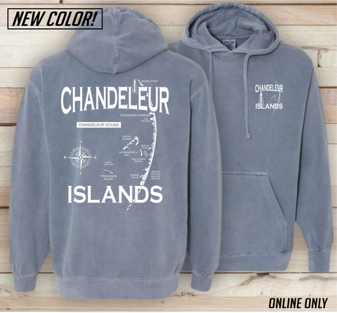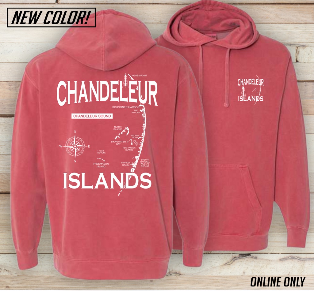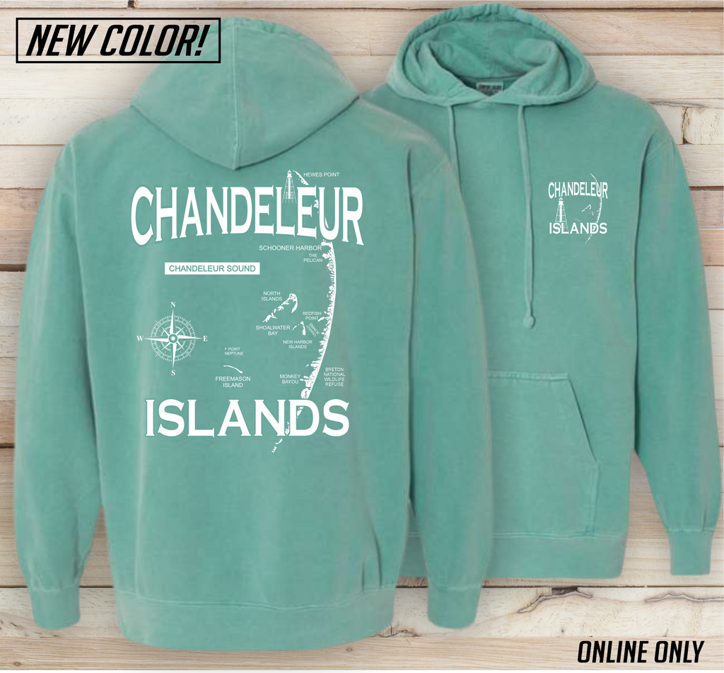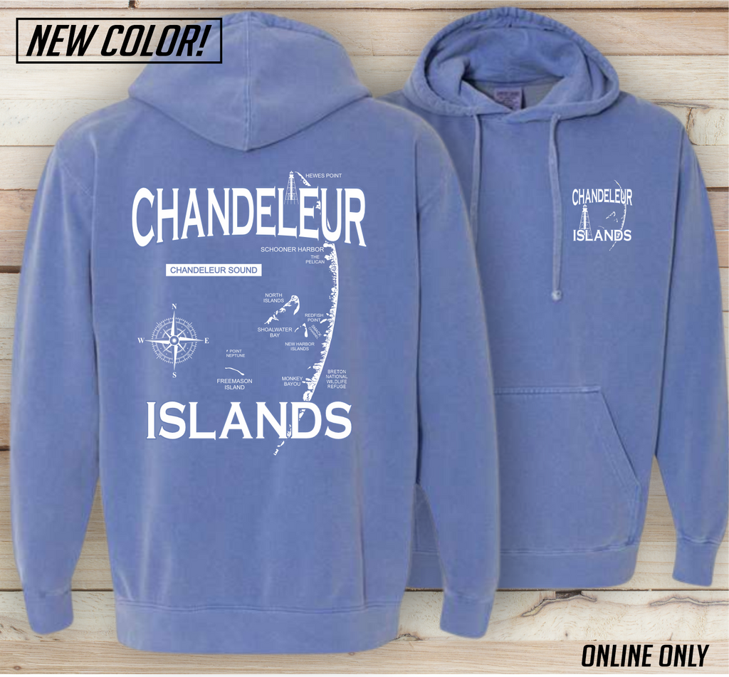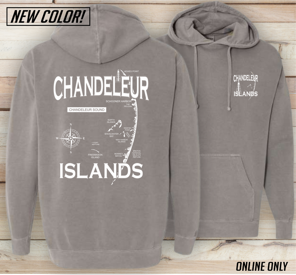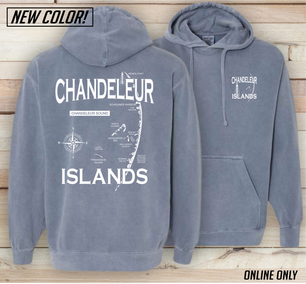Comfort Colors Brand Hoodie With Chandeleur Islands, Mississippi Print in White.